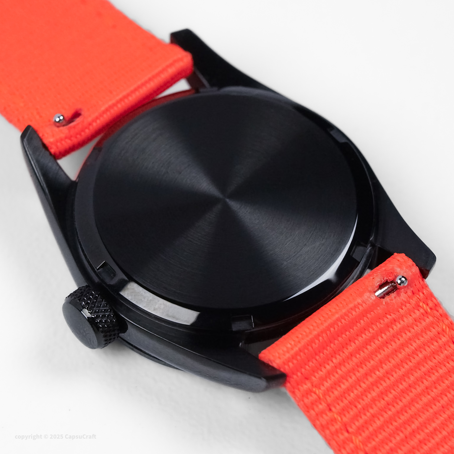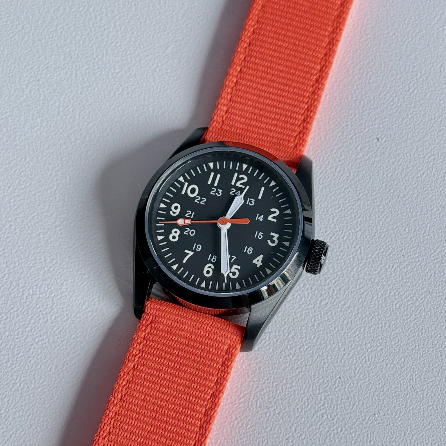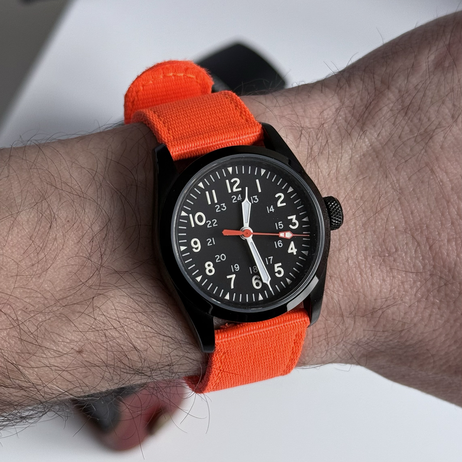 I had a day-glow orange strap from Timex that I never thought I’d use, but it made sense once I picked the bright orange seconds hand. I was also lucky that the brushed black PVD caseback perfectly matched the case.